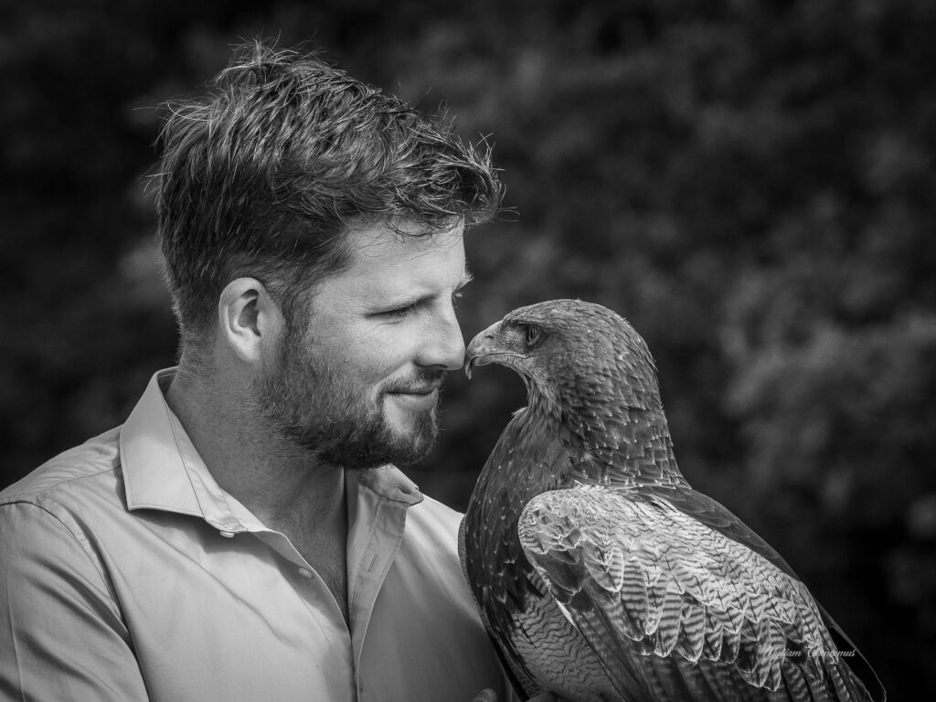 Simon Potier pratique la présentation de rapaces en vol libre depuis plus de vingt ans et est titulaire, depuis 2018, du certificat de capacité pour la présentation au public de tous rapaces et corvidés.